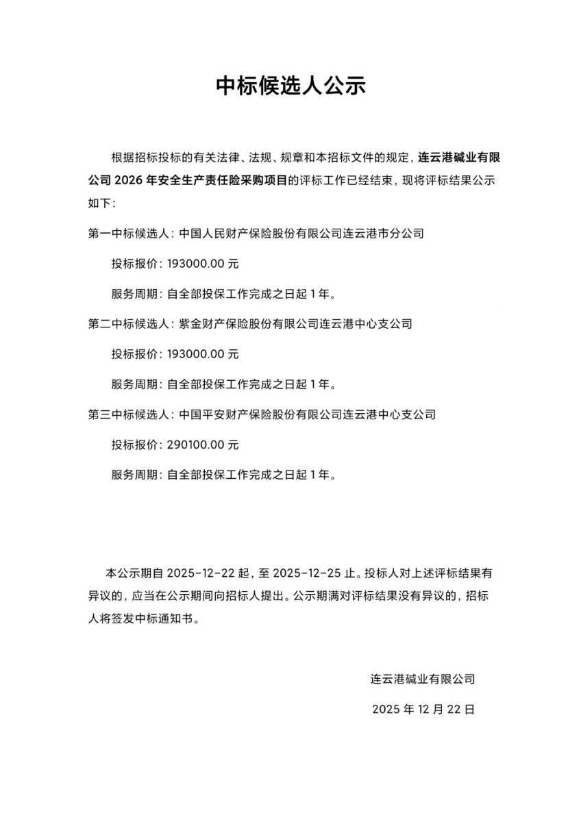 連云港堿業(yè)有限公司2026年安全生產(chǎn)責(zé)任險(xiǎn)采購(gòu)項(xiàng)目中標(biāo)候選人公示