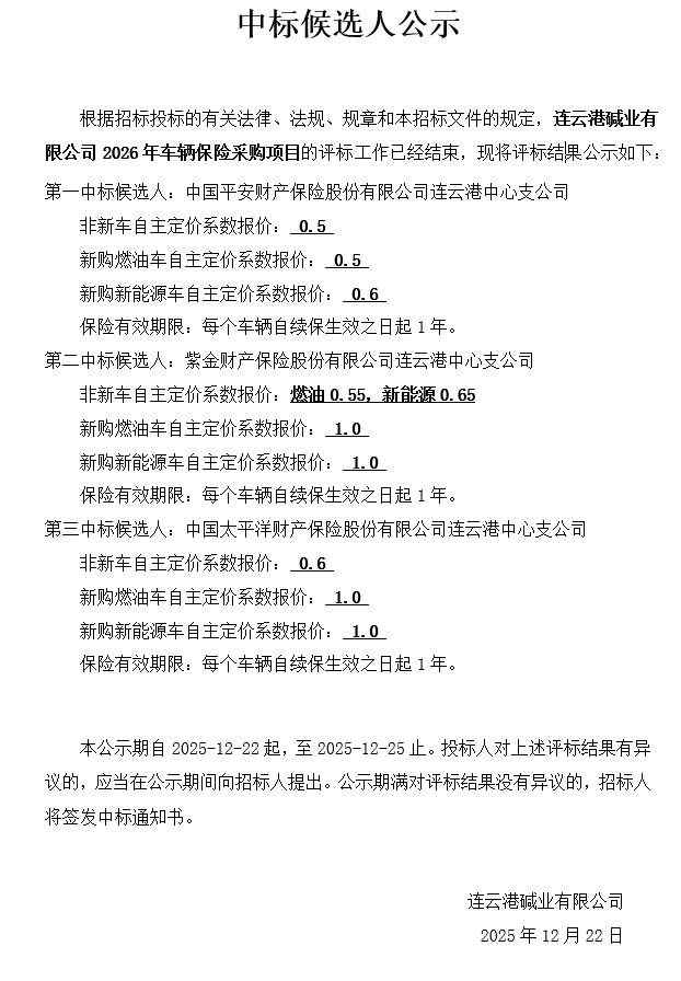 連云港堿業有限公司2026年車輛保險采購項目中標候選人公示
